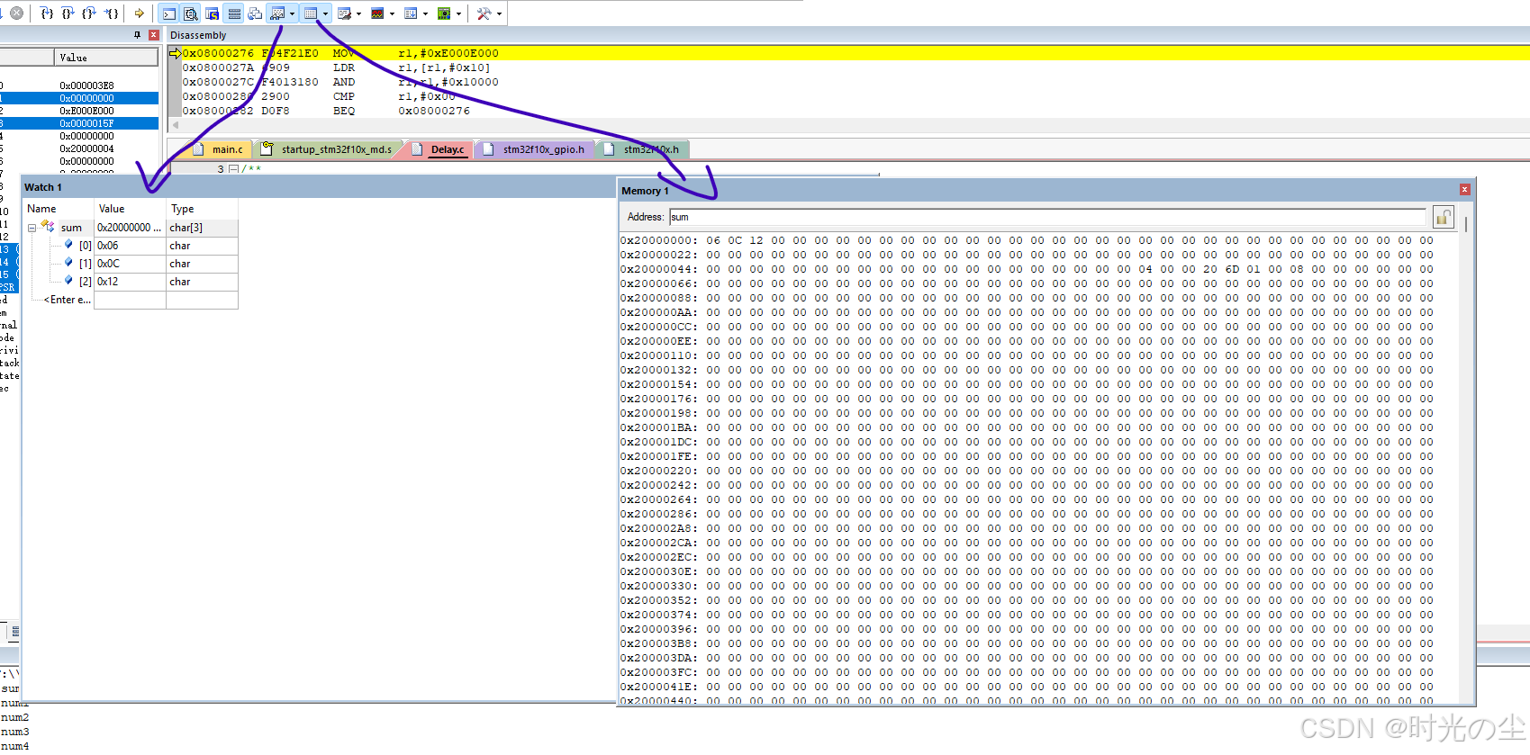 反汇编窗口:用来开启如下图,示当前执行的汇编代码,与源代码视图同步,有助于理解C/C++代码是如何转换为处理器指令的,以及在调试时实际执行的指令。
