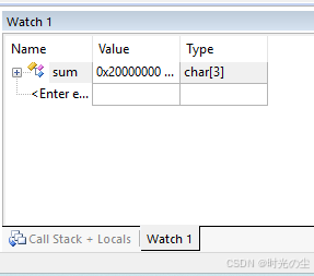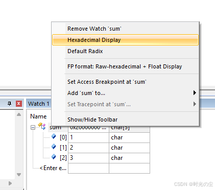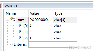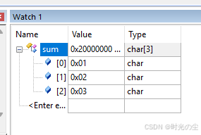 点击前面的小加号,可以看到当前数组数据,由于之前运行工一下,因此此时显示1,2,3,此时数据是十六进制显示: