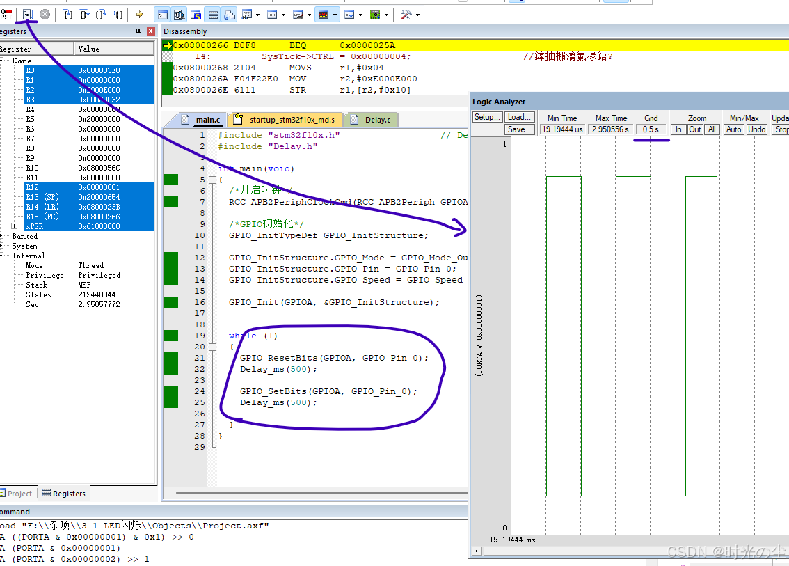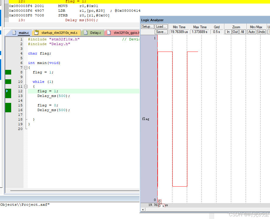 点击全速运行,可以发现按照500ms拉高和拉低一下电平(横线代表每格数据0.5s):
