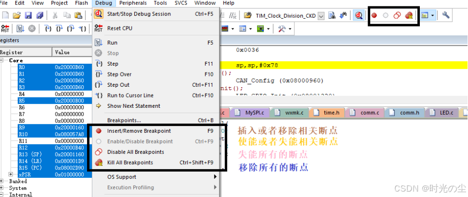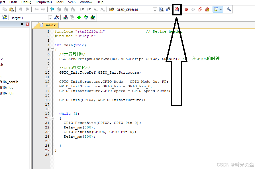 首先找到“Start/Stop Debug Sestion”,也就是如下图标,起作用是开启和关闭仿真调试:
