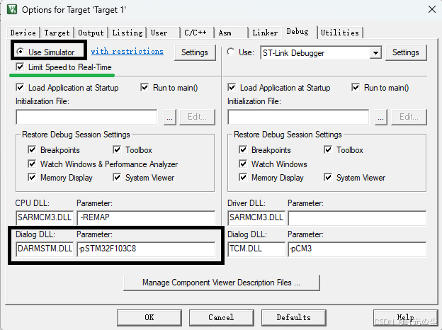 Dialog DLL 是指 调试器(Debugger)配置中的动态链接库(DLL),用于支持特定的调试接口或硬件仿真器。而系统自带的 DCM.DLL,是 Keil 提供的一个 调试通信中间层,用于优化调试器(如 J-Link、ULINK、ST-Link 等)与目标设备(MCU)之间的数据传输,可以适配不同的调试接口(如 JTAG、SWD、cJTAG),并自动选择合适的通信方式,不过这个毕竟是通用的,我们这里使用纯原生的,我们使用ST-Link,这里使用 DARMSTM.DLL ,当时如果使用J-Link可以使用JLinkARM.dll 根据自己回头使用下载器进行选配。