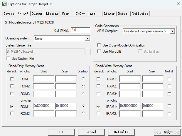 Parameter(参数) 是 Dialog DLL 的附加选项,用于传递特定的调试或烧录参数给底层调试器(如 ST-Link、J-Link 等)。它的具体含义取决于所使用的 调试器类型 和 目标芯片。同样的,我们在下载完编译器,选配好芯片后,由于我们使用的是STM32F1系列单片机,是ARM3内核的,其给我们默认的是 -pCM3 ,它也是通用的,它仅声明内核,不提供芯片的 Flash 大小、外设信息等细节。因此我们想要具体使用哪款新品,就声明具体型号(-pSTM32Fxxx),这里使用的是STM32F103C8T6,因此声明-pSTM32F103C8。
