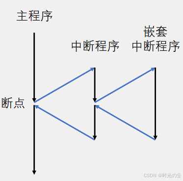 中断嵌套:当一个中断程序正在运行时,又有新的更高优先级的中断源申请中断,CPU再次暂停当前中断程序,转而去处理新的中断程序,处理完成后依次进行返回。