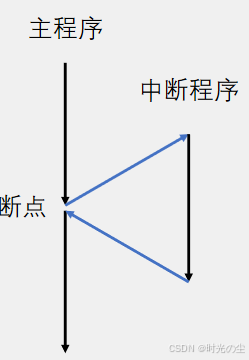 中断:在主程序运行过程中,出现了特定的中断触发条件(中断源),使得CPU暂停当前正在运行的程序,转而去处理中断程序,处理完成后又返回原来被暂停的位置继续运行;