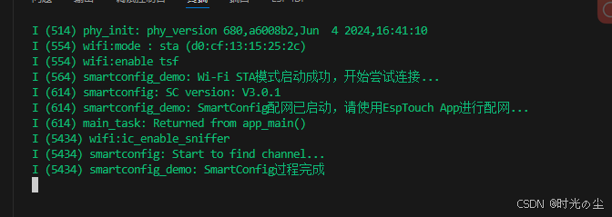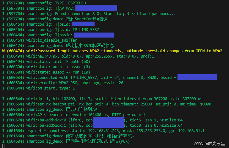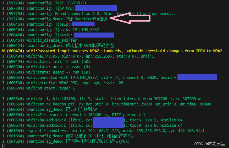 当我们点击完确定后,发送MAC板子找到 SmartConfig 信道,获取到我们所连接的 WiFi 的账号密码等,然后打印成功连接: