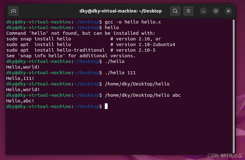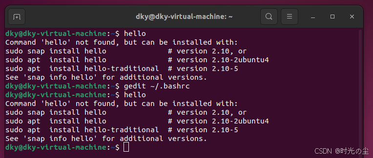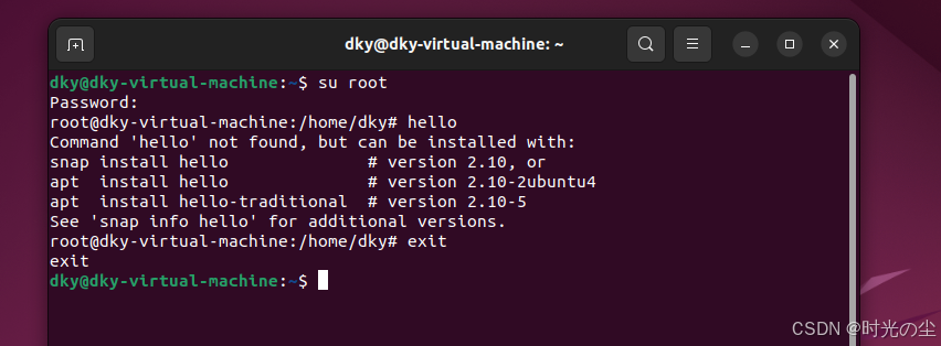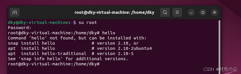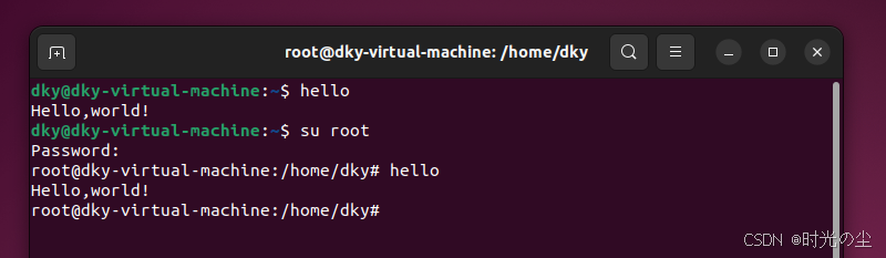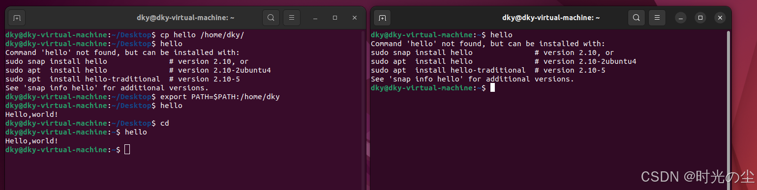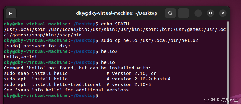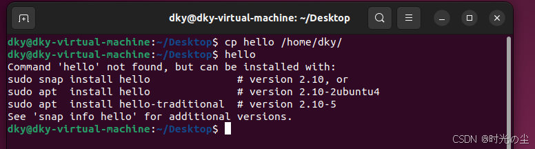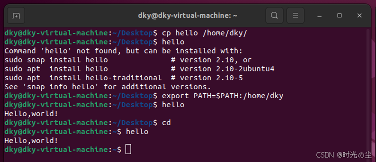 除了上述方法,我们还可以使用如下方法进行临时设置他,首先我们将hello移到/home/dky/目录下: