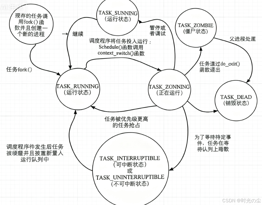 | 运行态 | TASK_RUNNING | 进程要么正在 CPU 上执行,要么在就绪队列等待调度。新进程通过fork()创建后进入此状态;处于可中断 / 不可中断睡眠态的进程,等待的事件发生后会被唤醒回到该状态;停止态的进程 “继续” 后也会回到运行态;还可能被更高优先级进程抢占后暂时离开运行态。 |