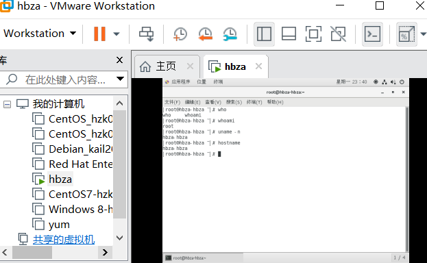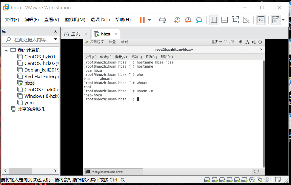 然后 hostname 或者uname -u都可以查看自己的主机名,如果再新打开一个终端就能看到自己的主机名已经修改过变成hbza-hbza了。