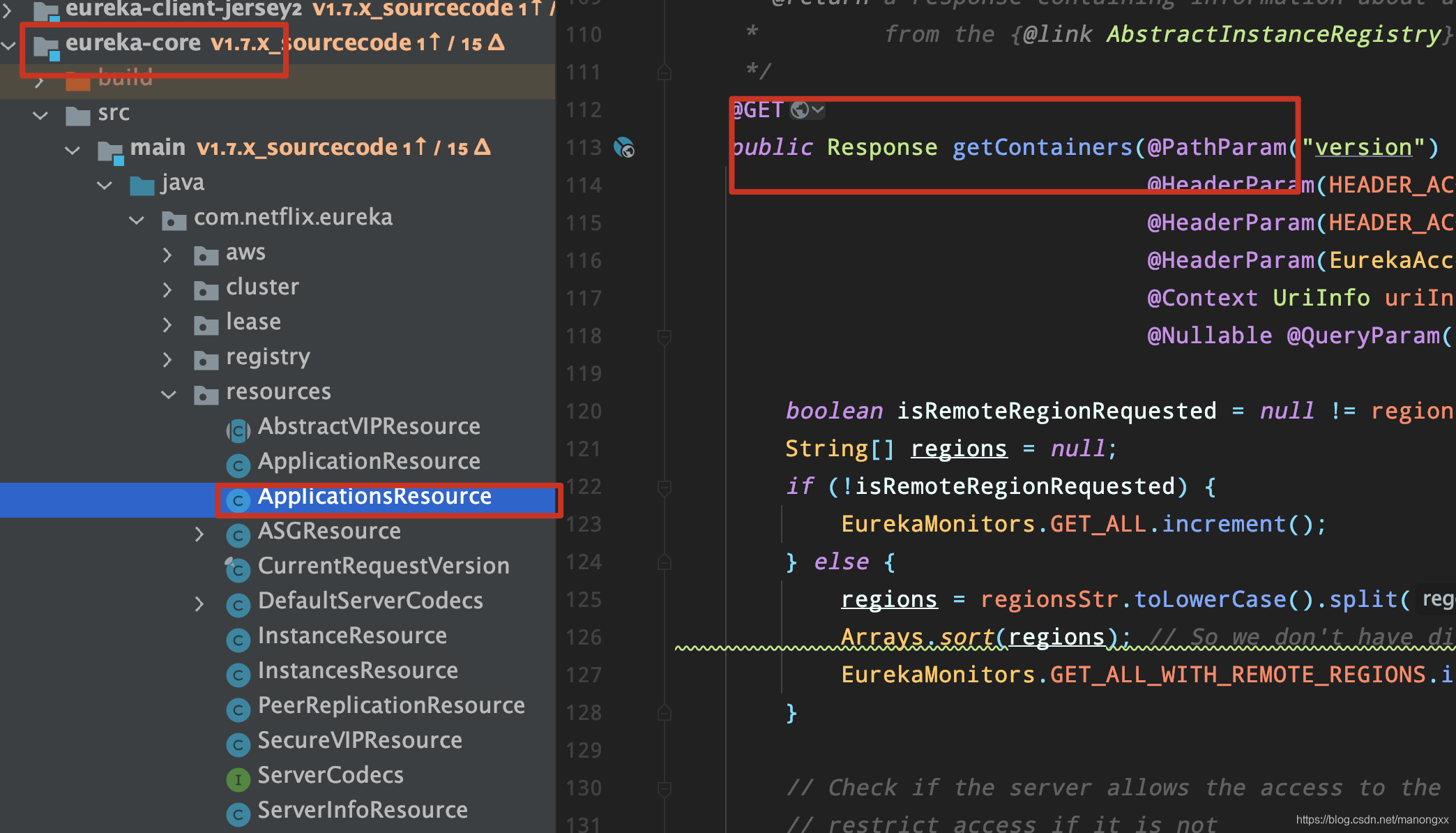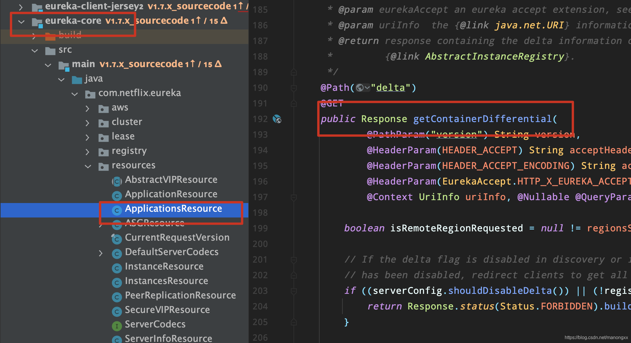 在这个方法里可以看到registry.getApplications()和registry.getApplicationDeltasFromMultipleRegions(key.getRegions())两个方法,一个全量,一个增量,我们只分析增量方法。
