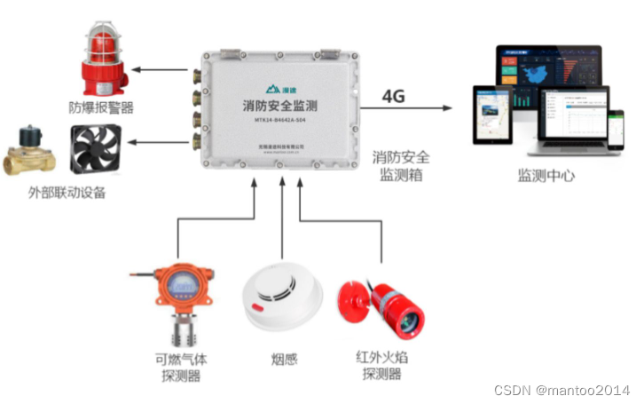 消防安全监测模块由消防安全监测仪,火焰传感器和烟感传感器组成。MTK14-SR411-S04监测仪采用4G无线通信方式,可集成多路红外火焰探测器和烟感,检测到异常后,立即将报警信息实时上传至管理中心,通知相关管理人员紧急处理,同时可联动消防设施,自动灭火,减少损失,加强企业安全管理。主要用于工厂消防安全监测领域,如储油罐区、配电房、包装盒存放区域的消防监测。