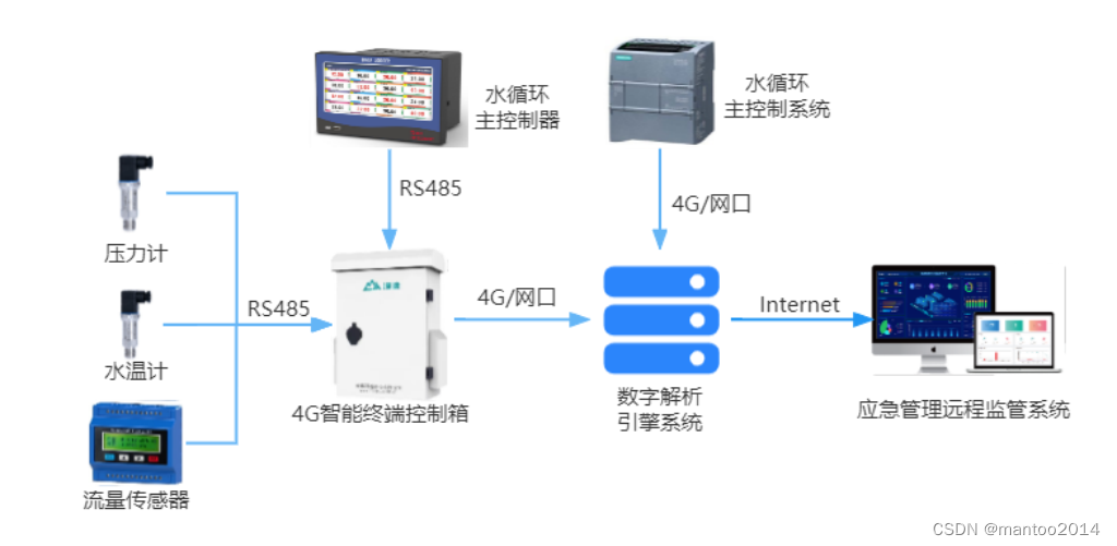 硬件设备:水温传感器、压力传感器、超声波流量计,漫途应急安全监管控制箱