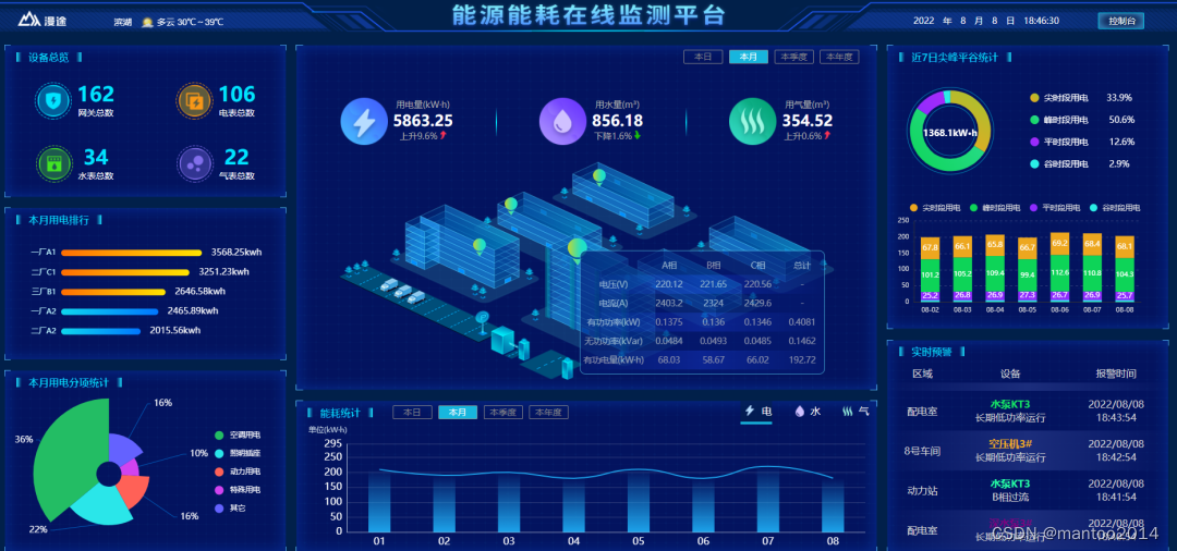 根据实时采集电量,形成时段曲线图、各设备3D饼图,报警数据实时刷新显示。