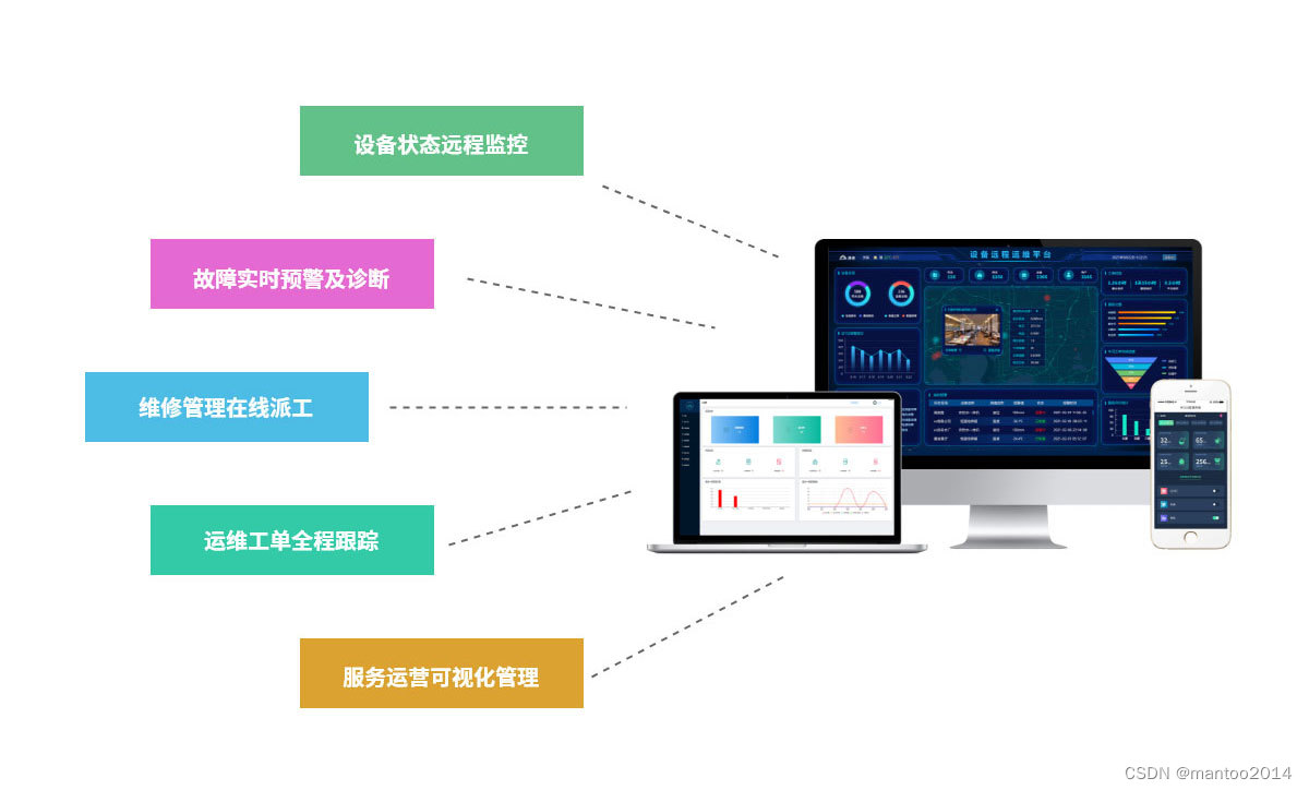 MTIC-EQUIP设备远程运维平台,通过智能测控终端采集设备,将各种数据上传到云平台,存储、整理、分析,通过智能应用系统实现在线监控、记录、查询、统计、分析、修改、报警等操作,实现远程智能化管理,提高企业智能化管理水平。