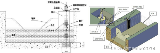 在上游入水口处布设1个水位计。选择三个监测断面,每个断面间隔150m。每个断面设置2个扬压力孔,每个孔里面放置1个硅压式扬压力计,并在每个断面设置1个数据采集单元。同时在下游坝址建三角形量水堰。渗流量观测采用量水堰计观测,量水堰计布置在排水道侧壁上。埋设安装需配置堰板,仪器置于堰板上游1米以外,安装位置堰槽侧壁开凹槽,仪器固定后凹槽内放置砾石滤水。