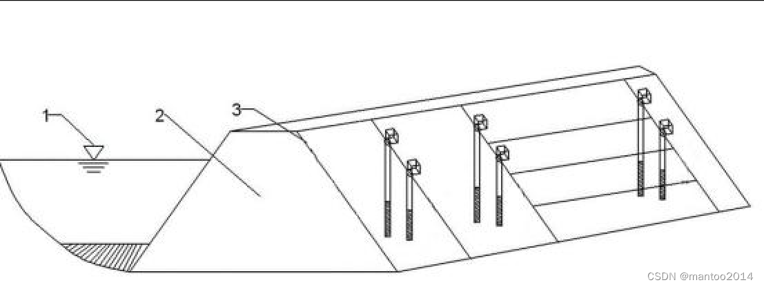 坝体浸润线监测:选定3个观测断面,在每个横断面内横断面内从坝顶往下游坝坡布置2个测压管,观测测压管内水位,绘制浸润面,该方法观测绘制的浸润面直观,一目了然。