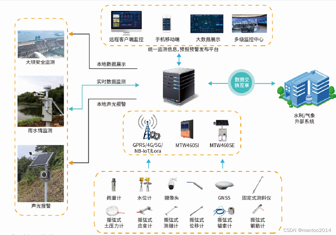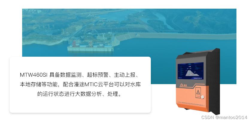 MTW460安全监测信息采集终端提供多路RS485接口和4~20mA模拟量采集接口,可以接入模拟信号传感器或是RS485设备。通过4G或者网口联网,实现数据实时采集与上传网络服务器,实现平台端的远程监测。主要应用于水库结构安全监测场景,可以根据客户实际应用场景进行定制,满足客户定制化需求。
