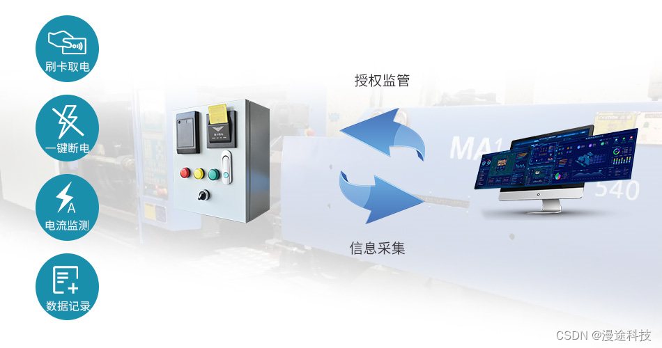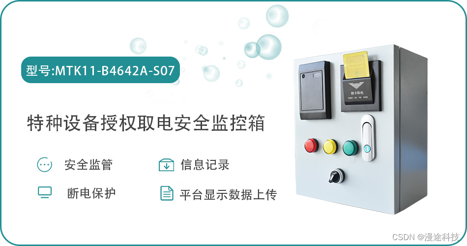 漫途特种设备授权取电安全监控箱,规范设备取用电流程,实现双重授权。能够对设备的用电耗电和运行时间进行监管,并将数据实时采集上传至平台。相关责任人员通过对耗电分析和运行时间来制定灵活的维修维护计划。