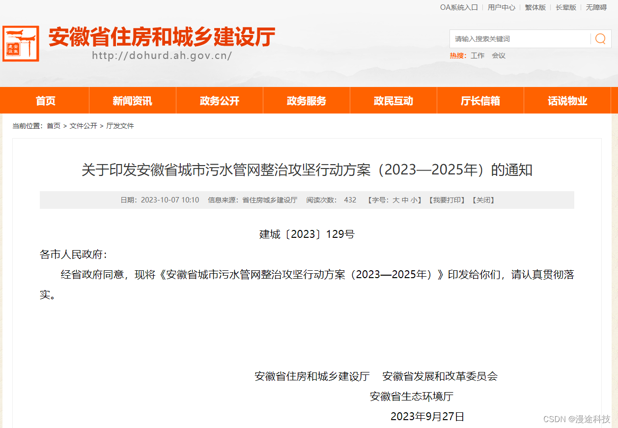 近日,安徽省印发了城市污水管网整治攻坚行动方案(2023—2025年)的通知。其中提出到2025年,全省设市城市基本完成建成区市政污水管网修复改造。县城建成区基本消除生活污水直排口,基本消除收集处理设施空白区,基本消除黑臭水体,城区污水收集处理效能明显改善。