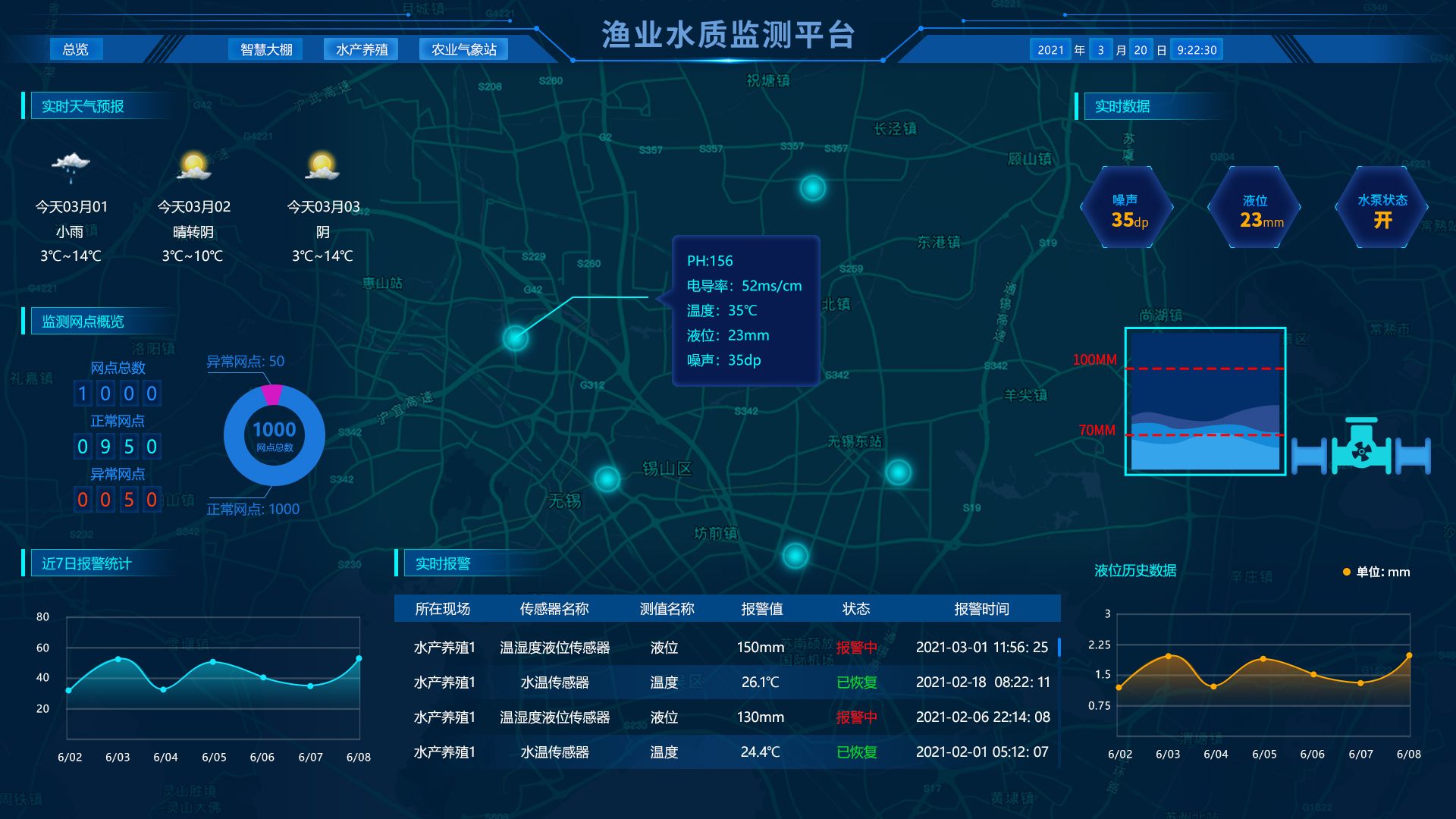 在投料方面,可根据养殖品种(如草鱼、南美白对虾)的生长周期,在平台设定每日多时段定时投料计划,同时结合实时溶氧、水温数据动态调整 —— 比如阴雨天溶氧偏低时,自动减少投料量,避免鱼虾因消化负担加重缺氧;而当水体溶氧持续偏低,或增氧机出现故障无法启动时,终端会立即触发氧气报警:不仅现场声光提醒,还通过短信、微信、邮件等多渠道向养殖户推送告警信息,最大限度降低翻塘风险。