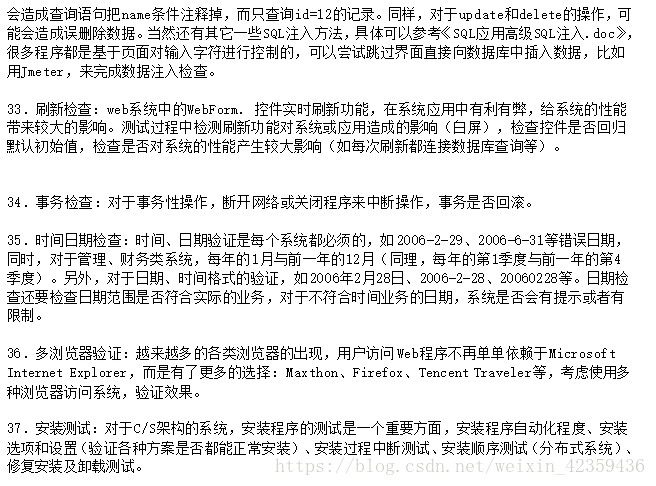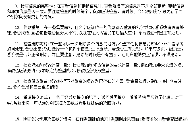 2.功能相关性检查:删除/增加一项会不会对其他项产生影响,如果产生影响,这些影响是否都正确,常见的情况,增加某个数据记录以后,如果该数据记录某个字段内容较长,可能会在查询的时候让数据列表变形。