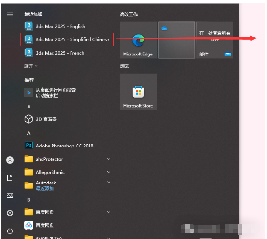 9.创建桌面快捷方式:①点击桌面任务栏中的【开始图标】>点击【所有应用】>双击展开【Autodesk】文件夹②将【3ds Max 2025- Simplified Chinese】图标拖到电脑桌面。