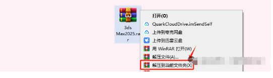 1.找到下载好的3ds Max 2025安装包,解压安装包:①鼠标右击【3ds Max 2025】压缩包②选择"解压到当前文件夹"