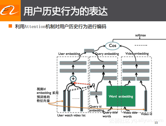 用户历史行为表达的最简单的方案就是用视频表示用户,也就是将用户之前所观看过的视频的列表的ID放在一起存储起来,或者先做一个embedding的编码,然后将embedding向量进行平均,用平均数来表达用户的历史偏好。但是这里也存在一定的问题,就是用户历史的观看行为以及在电商中的购买行为是多种多样的,可能是多个领域下的行为,而这些信息中究竟哪些信息与当前场景下的检索词是更加相关的呢?所以如果能够找到与当前检索词更加相关的历史偏好就能够极大地提升排序的结果。举个简单的例子就是用户搜索了“体育视频”这个词,某些用户之前观看过足球类的视频,而有些用户则观看过篮球类的视频,通过检索词的embedding与之前embedding的相似度比较或者做一个Attention,用当前这个“体育视频”去找到与其更加相关的这些历史行为,这样就能实现对于不同用户产生不同的表达,并且忽略掉其他不相关的信息,这样就能更好地获取用户在当前检索词下的偏好,使用此偏好与之前提到的整体的模型框架整合到一起之后就能够将召回的结果展示给用户。这就是对于表达用户历史行为的改进方案,通过利用Attention机制的方案以及前面几种不同的改进方法在优酷短视频搜索场景里对于转化产生了很大的提升。