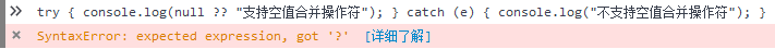 注意以上代码不能和有 可选链操作符(?.) 和 空值合并操作符(??) 的代码在同一个 js 文件里,不然仍然会被 JS 语法解释器优先抛出语法错误。