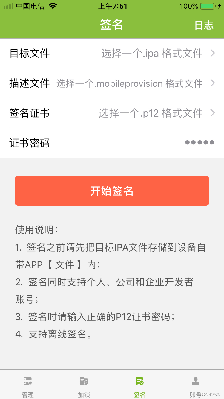 签名 — 支持iPhone手机端对IPA的签名功能,解决了暂无Mac电脑情况下的签名问题。