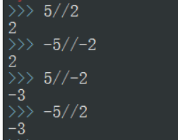 2)如果被除数或者除数其中一个为正数,一个为负数,则结果需要向下取余。这里重点说一下向下取余,初学者肯定会和其他编程语言的搞混淆。举个简单例子,在C语言中,-5对2整除运行结果是-2,但是在python程序中,运算结果需要向负无穷靠近,即向下取余,-5//2运行结果为-3。