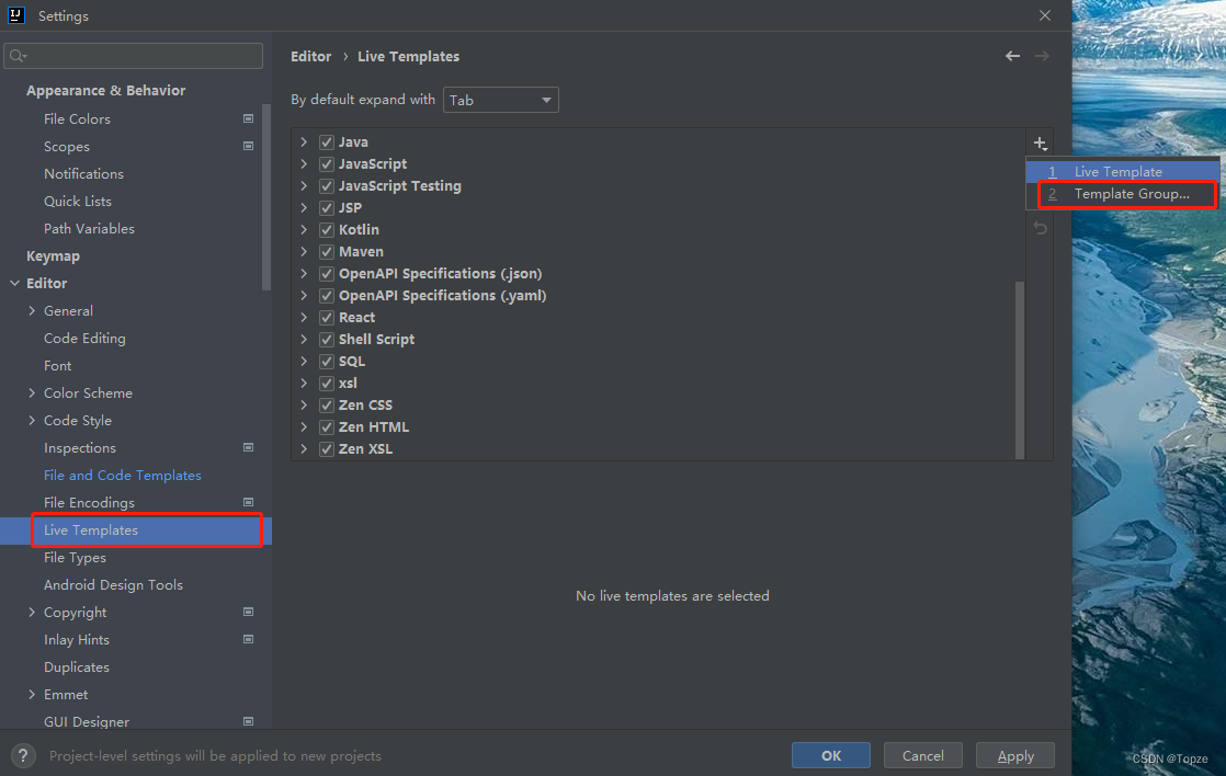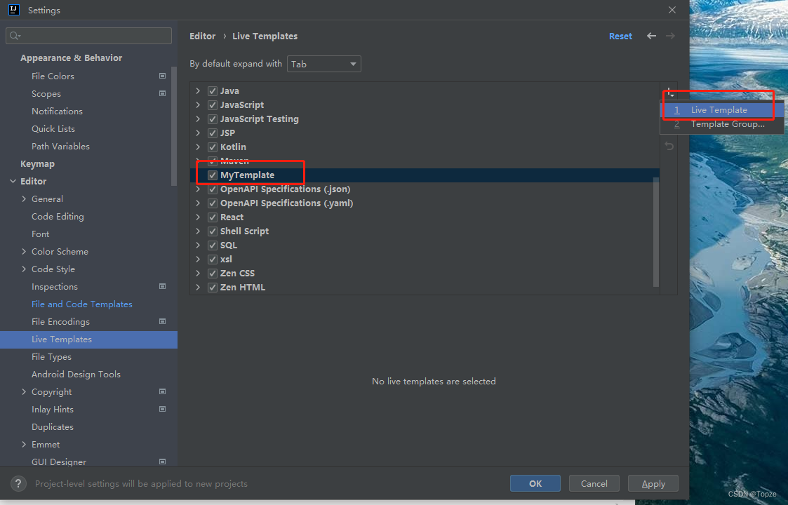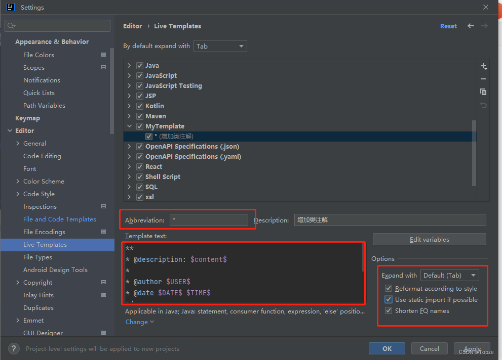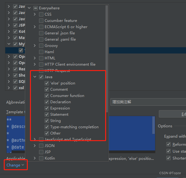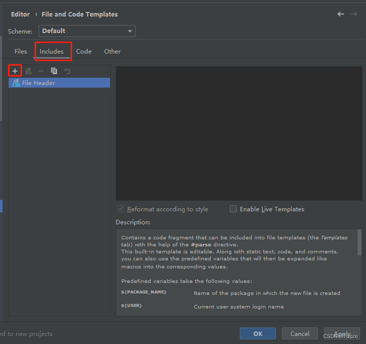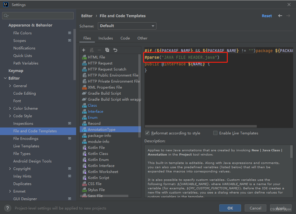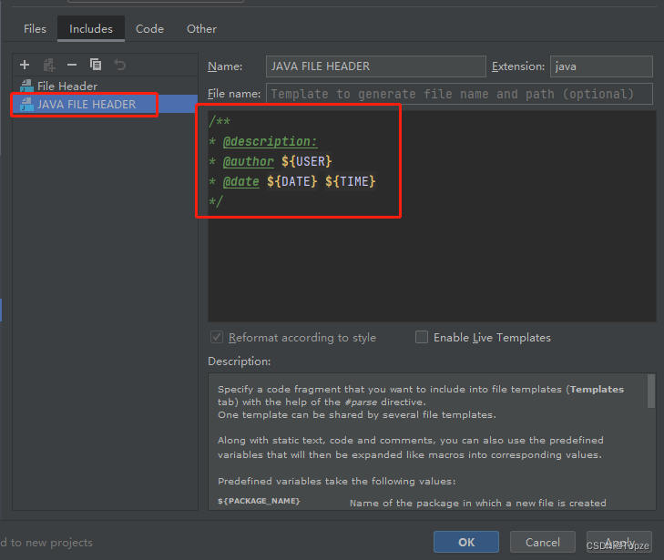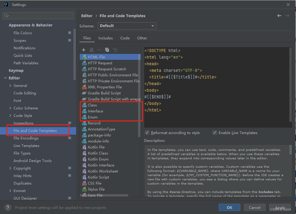 选中class、interface、enum加上自己定义的创建类时需要的模板。