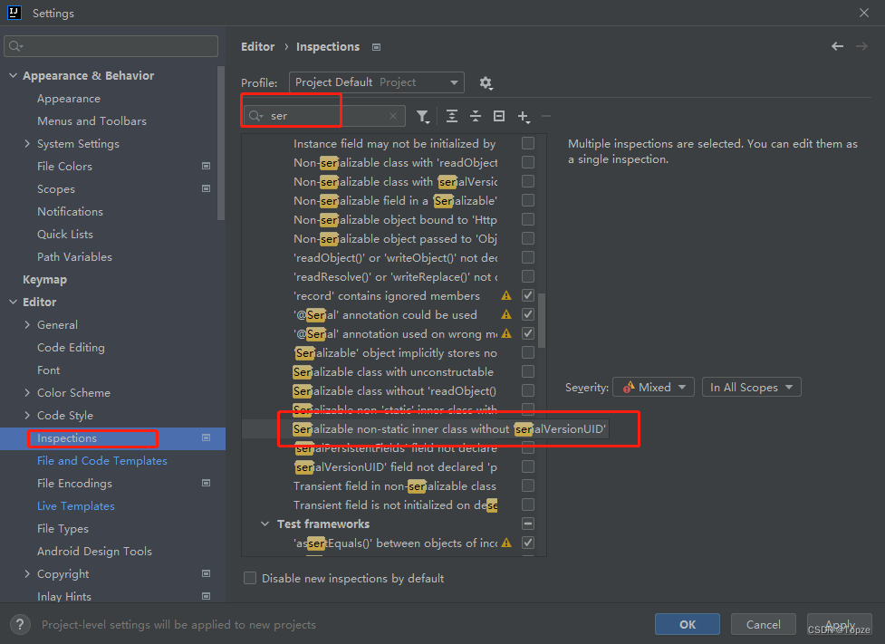 4、配置继承Serializable接口后,未定义id的警告提醒