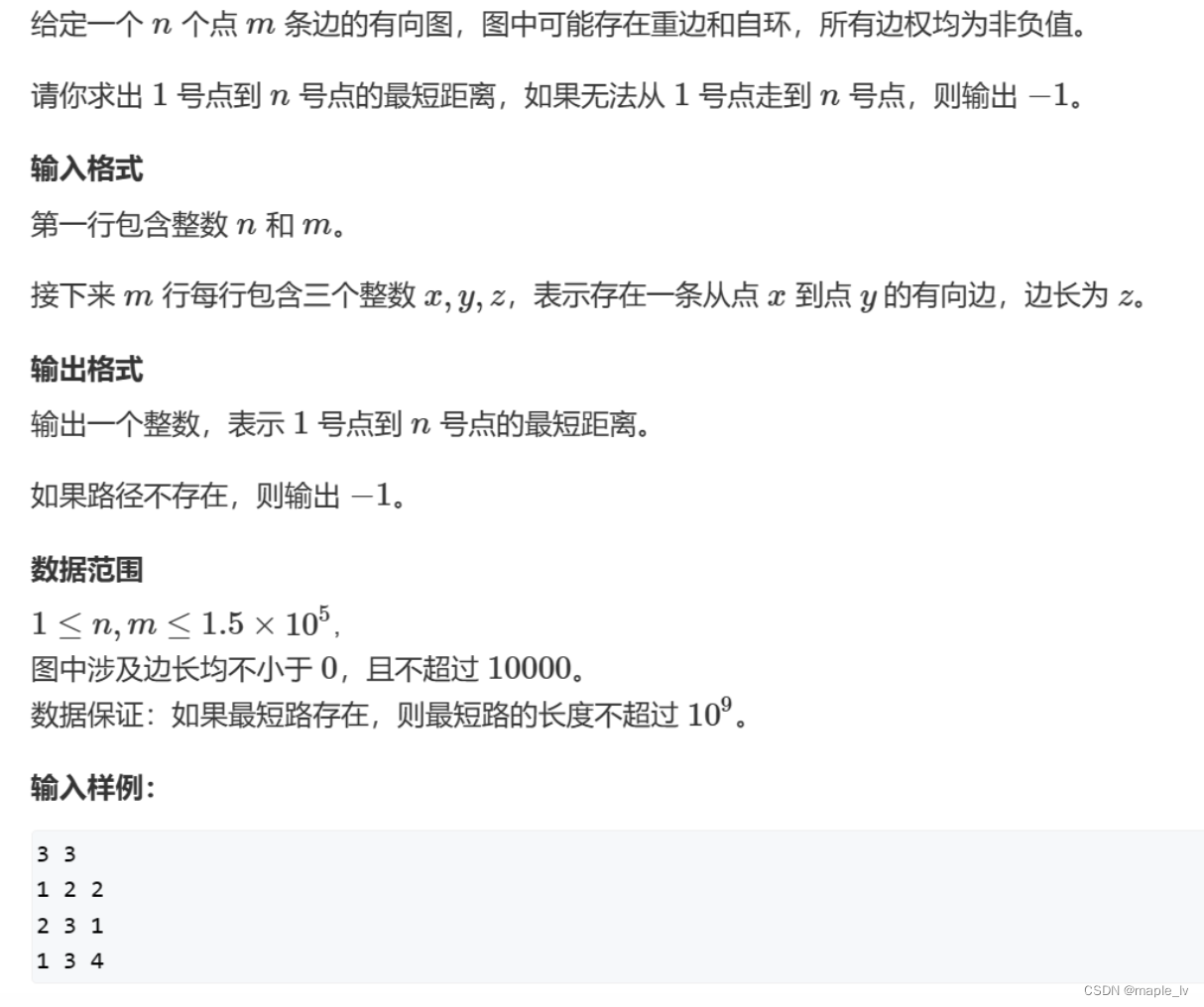 请你求出 1 11 号点到 n nn 号点的最短距离,如果无法从 1 11 号点走到 n nn 号点,则输出 − 1 −1−1。
