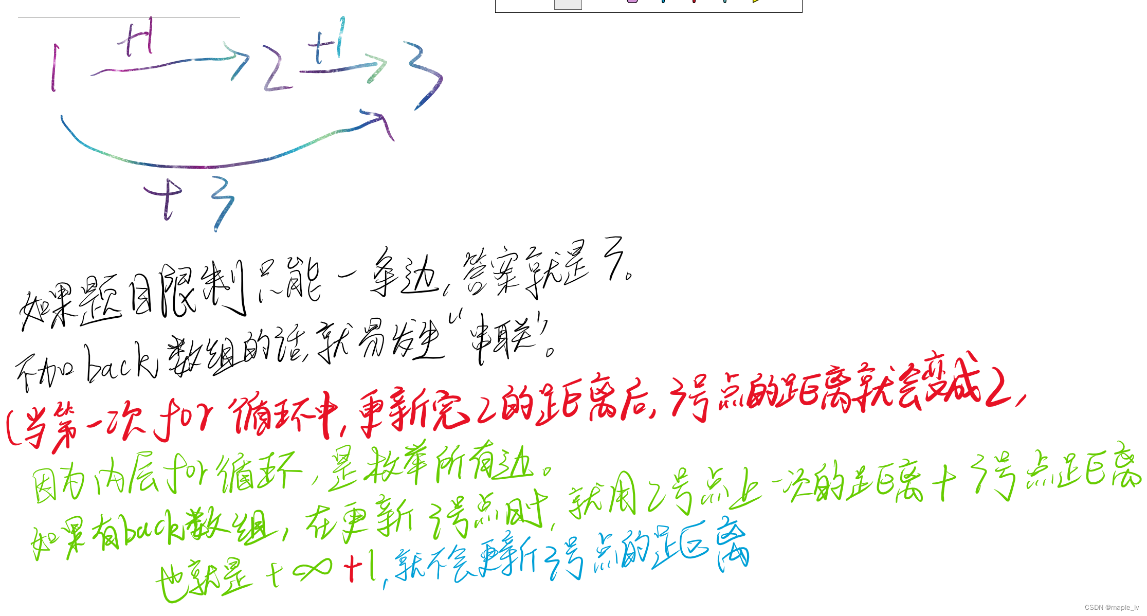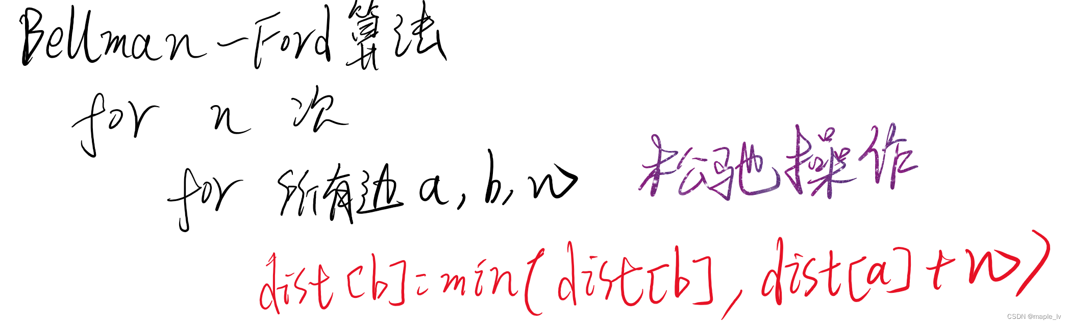 (通俗的来讲就是:假设1号点到n号点是可达的,每一个点同时向指向的方向出发,更新相邻的点的最短距离,通过循环n-1次操作,若图中不存在负环,则1号点一定会到达n号点,若图中存在负环,则在n-1次松弛后一定还会更新)