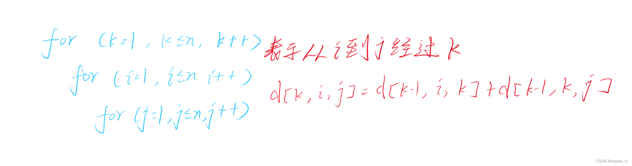 floyd算法的原理是基于动态规划的基础上实现的,因为是稠密图我们通过邻接矩阵来存储,我们将各点距离初始化为正无穷(该点到自己的距离为0),然后进行三重循环,每层循环从第一个节点开始遍历,直至遍历到第n个节点,设最外层循环当前节点为k,中间层循环的当前节点为i,内层循环的当前节点为j。其中d[k, i, j]表示从i到j经过1到k个点的最短距离(k表示阶段),动态转移方程就是d[k, i, j] = min(d[k, i, j], d[k - 1, i, k] + d[k - 1, k, j]), 优化后变成 d[i, j] = min(d[i, j], d[i, k] + d[k, j])。我们以节点k为中介点,以节点i为起点,节点j为目标点,判断由起点i经由中介点k到达目标点j的代价值,是否小于由起点i直接到目标点j的代价值,若小于,则将从起点i到目标点j的代价值d[i][j]更新为d[i][k]+d[k][j]。