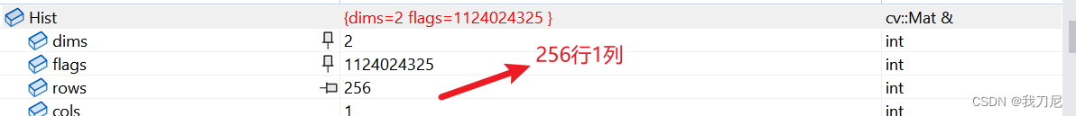 这里得gray为测试灰度图。看下运行完calcHist函数后,Hist的维数。可以看到Hist就是一个256行1列Mat类型的变量,可以看做一个数组索引。