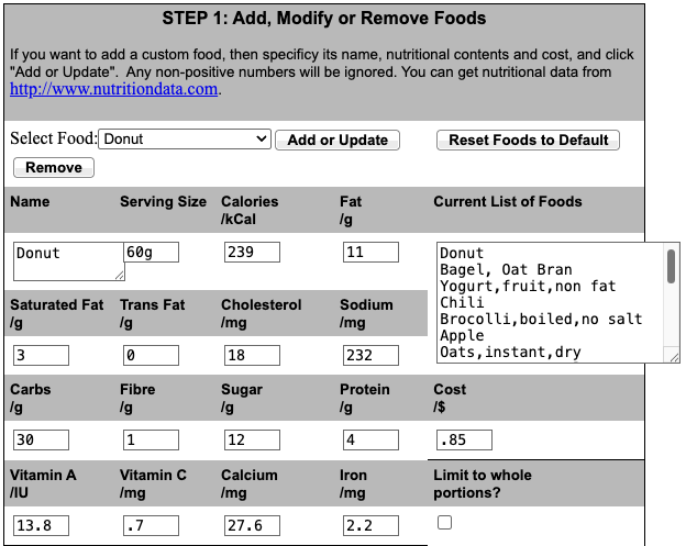 本程序用于求解满足指定营养需求且总成本最低的膳食方案。系统内置一份默认食物清单(附带完整营养数据库),用户可在此基础上增删食物;所有修改将在保存会话后自动记忆。