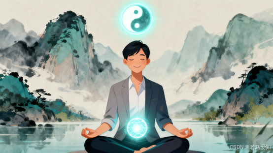 道家“天人合一”与现代高效工作者融合图