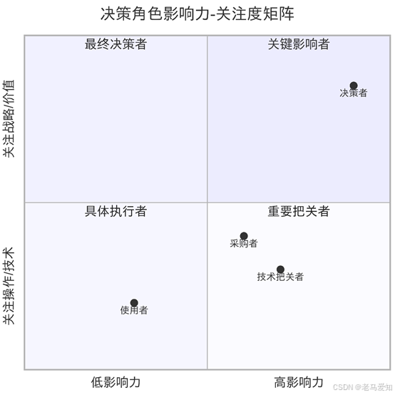 - 影响力:“最终拍板权” 。他们关心的是宏观价值和战略契合,而非技术或价格细节 。他们是资源的最终分配者 。