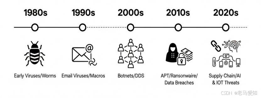 图注:示意图展现了网络攻击在动机、目标、手段等方面的关键演变节点。关键里程碑:1980年代(早期病毒/蠕虫 - 如莫里斯蠕虫),1990年代(邮件病毒/宏病毒),2000年代(僵尸网络/DDoS兴起),2010年代(APT/勒索软件/数据泄露),2020年代(供应链攻击/AI驱动威胁/IoT攻击 )