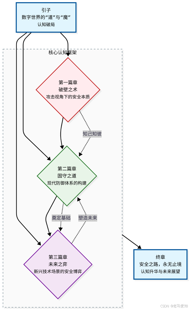 图注: 本图展示了专栏的结构:从“引子”出发,深入探索“攻击”、“防御”、“未来”三大核心板块,最终实现认知的升华与闭环。各板块之间相互关联,共同构成完整的认知框架。