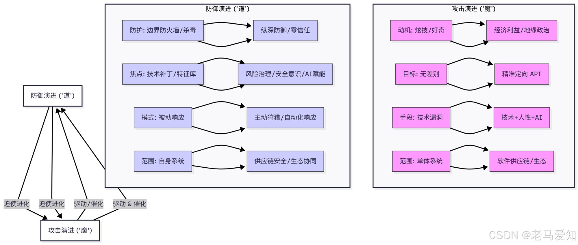 图注:直观展示了攻击手段(魔)与防御策略(道)之间相互驱动、共同演进的动态平衡。攻击方的每一次“进化”(动机、目标、手段、范围的升级),都迫使防御方进行相应的“升华”。