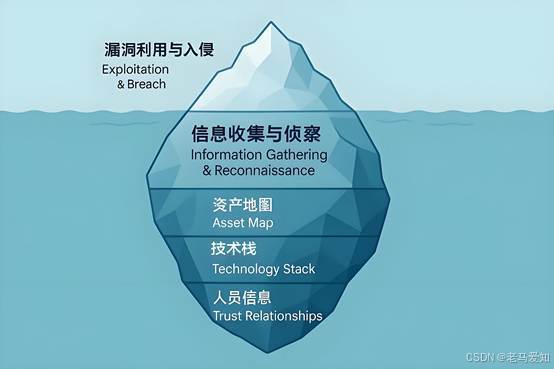 现代攻击思维已经将信息收集提升到了战略核心的地位。我们可以用一个“冰山模型”来理解: