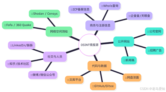 - 开源情报 (OSINT): 从公开可获取的信息源中收集和分析情报的过程。