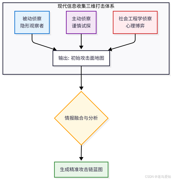 图注: 现代信息收集是一个多维、协同的体系,被动、主动和社会工程学侦察相互补充,最终通过情报融合,形成一幅能够指导精准打击的蓝图。