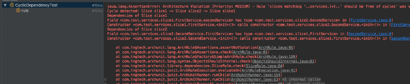 ArchUnit有两种测试类型,其中之一就像上面的测试用例那样。另外,也可以使用JUnit的Test注释编写测试。将RunWith参数更改为JUnit4.class并删除AnalyzeClasses注释。