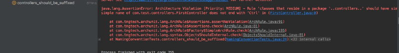 看到测试出了异常:“java.lang.AssertionError: Architecture Violation [Priority: MEDIUM] — Rule ‘classes that reside in a package ‘..controllers..’ should have a simple name ending with ‘Ctrl’’ was violated (1 time): the simple name of com.test.controllers.FirstController does not end with ‘Ctrl’ in (FirstController.java:0)”。