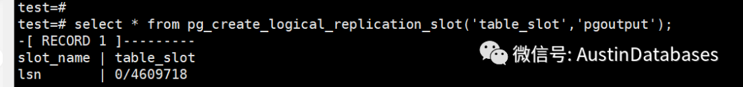 select * from pg_create_logical_replication_slot('table_slot','pgoutput');