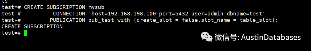 CREATE SUBSCRIPTION mysub CONNECTION 'host=192.168.198.100 port=5432 user=admin dbname=test'